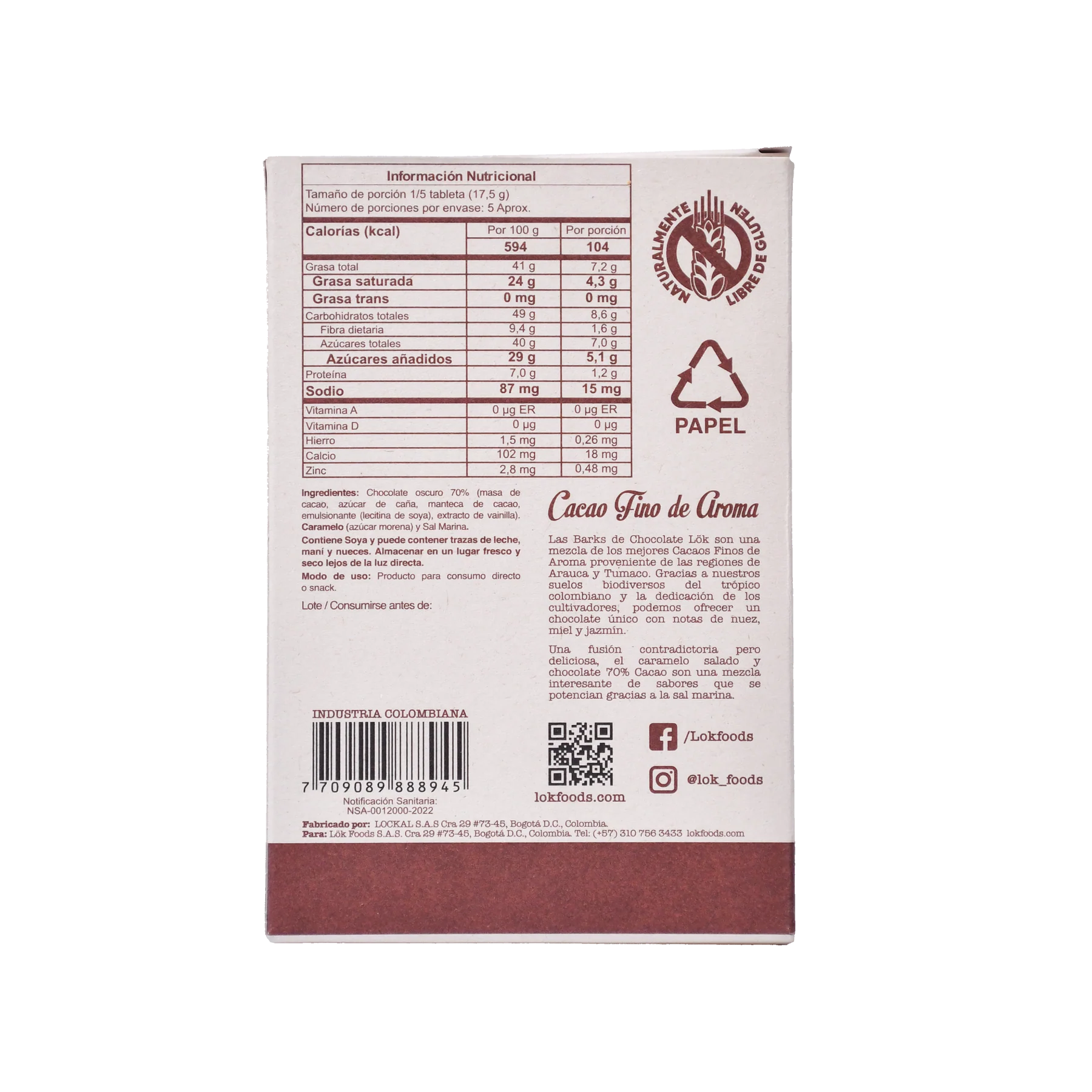 CHOCOLATE 70% CACAO CON SAL MARINA Y CARAMELO 85 GRAMOS LÖK